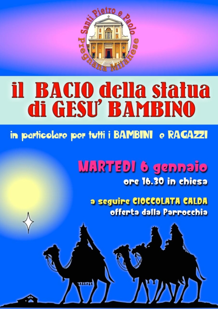 Nel giorno dell’Epifania, invitiamo tutti e, in particolare bambini e ragazzi, al bacio della statua di Gesù Bambino, alle ore 16:30 in chiesa.